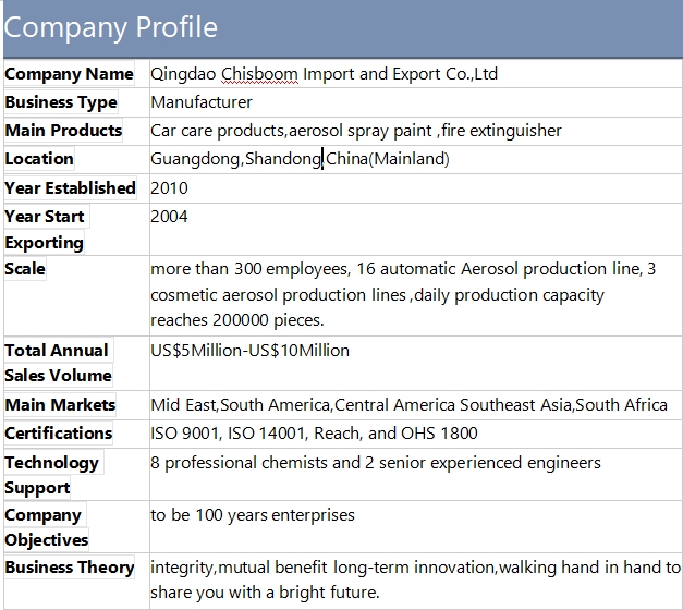 Chisboom fabrikatzaile profesionala da eta urrezko aerosolen pinturaren hornitzailea da. Establezimenduaz geroztik, etxeko eta kanpoko merkatuetan bezeroek oso maitatua izan da. Hornitzaile gisa, Urrezko Aerosolen Pinturaren iraunkortasuna eta praktikotasuna ziurtatu behar dira. Chisboom-ek talde profesionala eta instalazio osoak ditu merkatuaren aldaketei erantzuteko eta berrikuntza etengabea lortzeko.